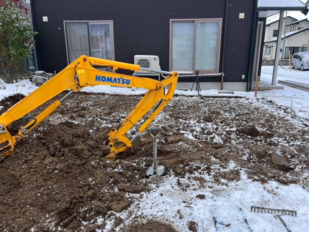 突然の大雪にはびっくりしました。表土にはうっすらと雪が積もっていましたが重機を使い不要な土を除去していきます。