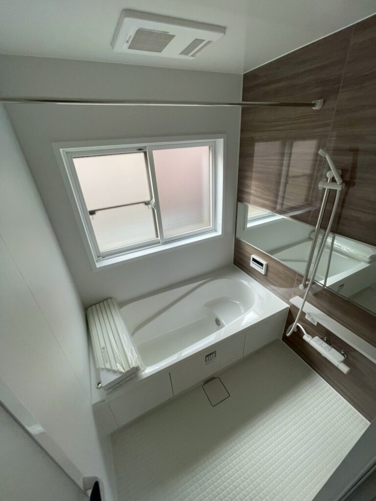 押入れや石油給湯器があり窮屈だった洗面所は、それぞれを撤去しクロスやクッションフロアを張り替えたり洗面化粧台の交換を行い明るく広々とした洗面所になりました。浴室はユニットバスに交換し浴槽を拡張したことで足をのばしゆったりと入浴することが可能です!一部の壁にはウッドパネルを使用し視覚からも落ち着ける空間に。🛁