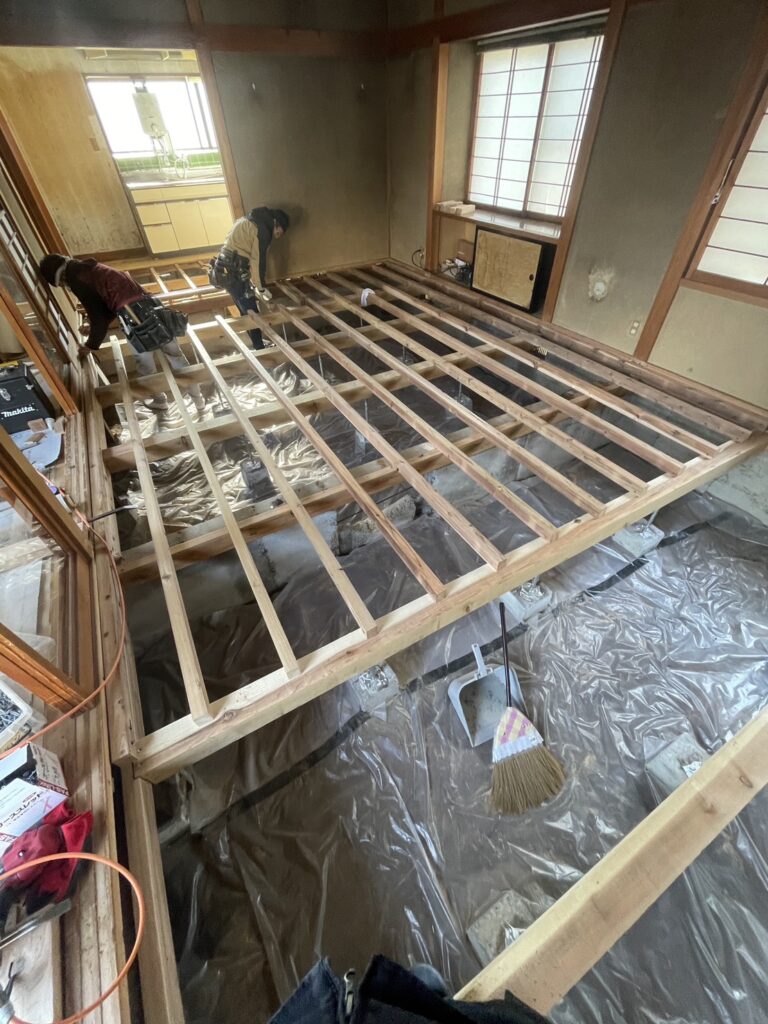 安全性と耐久性を確保するために内部の解体を行い傷んでいる下地材を新しい材料に交換し水平を確認しながら床組を調整いたしました。